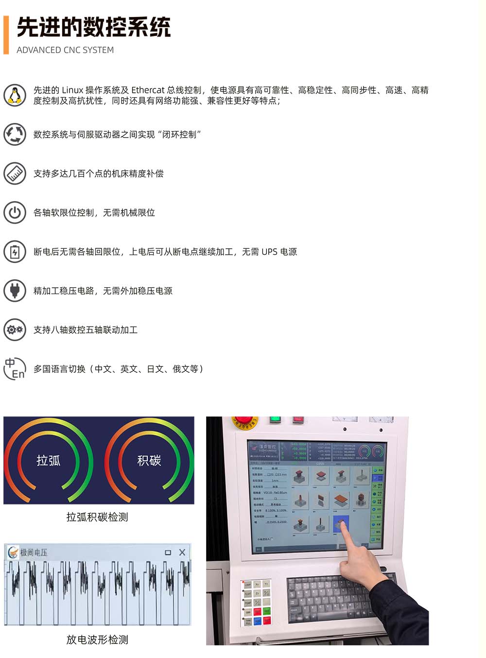 | 搭載總線控制的數(shù)控系統(tǒng)及高速采集放電系統(tǒng),表現(xiàn)出更加優(yōu)秀的加工指標(biāo),部分指標(biāo)已超越進(jìn)口機(jī)床 | ||